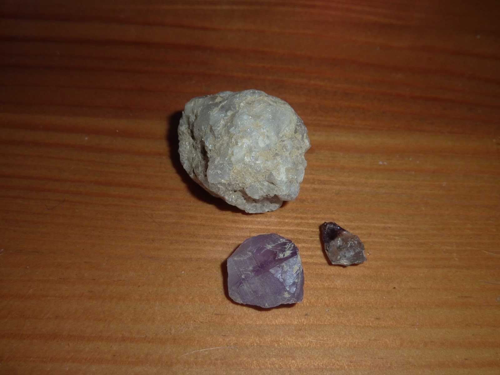 All our hard work for this! Peter found the larger amethyst, and I found the white quartz and tiny amethyst. |