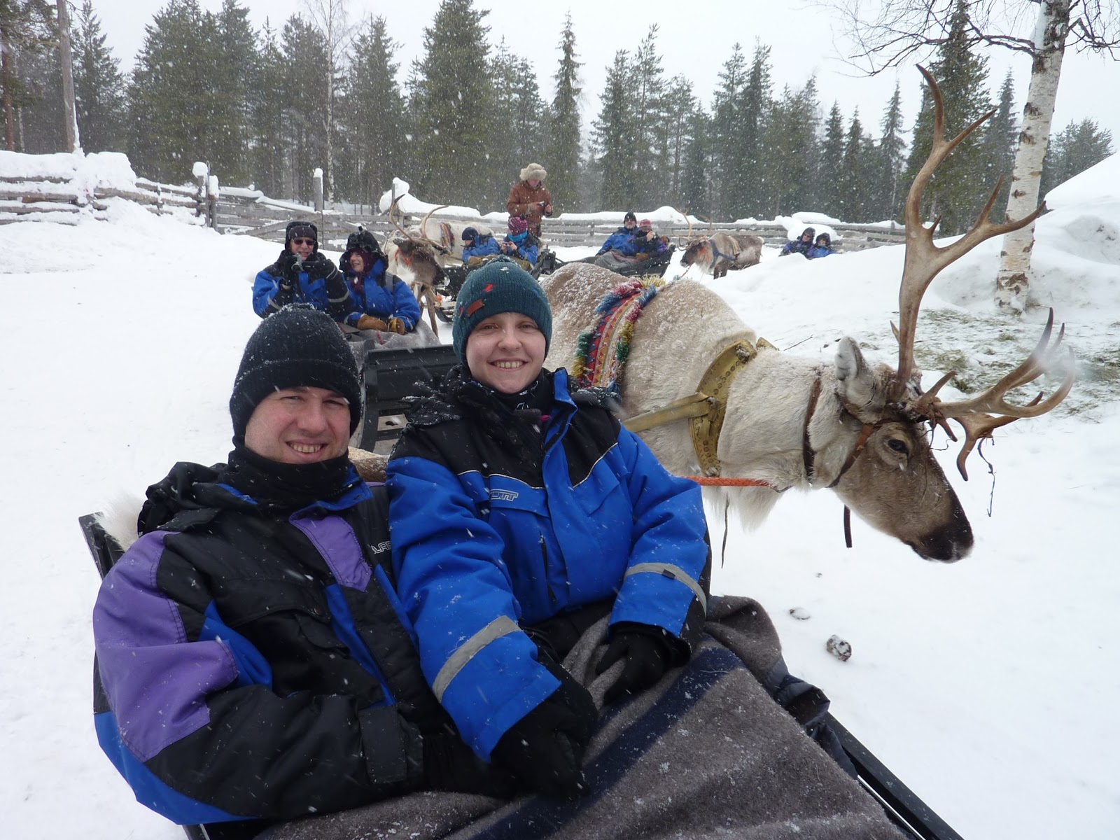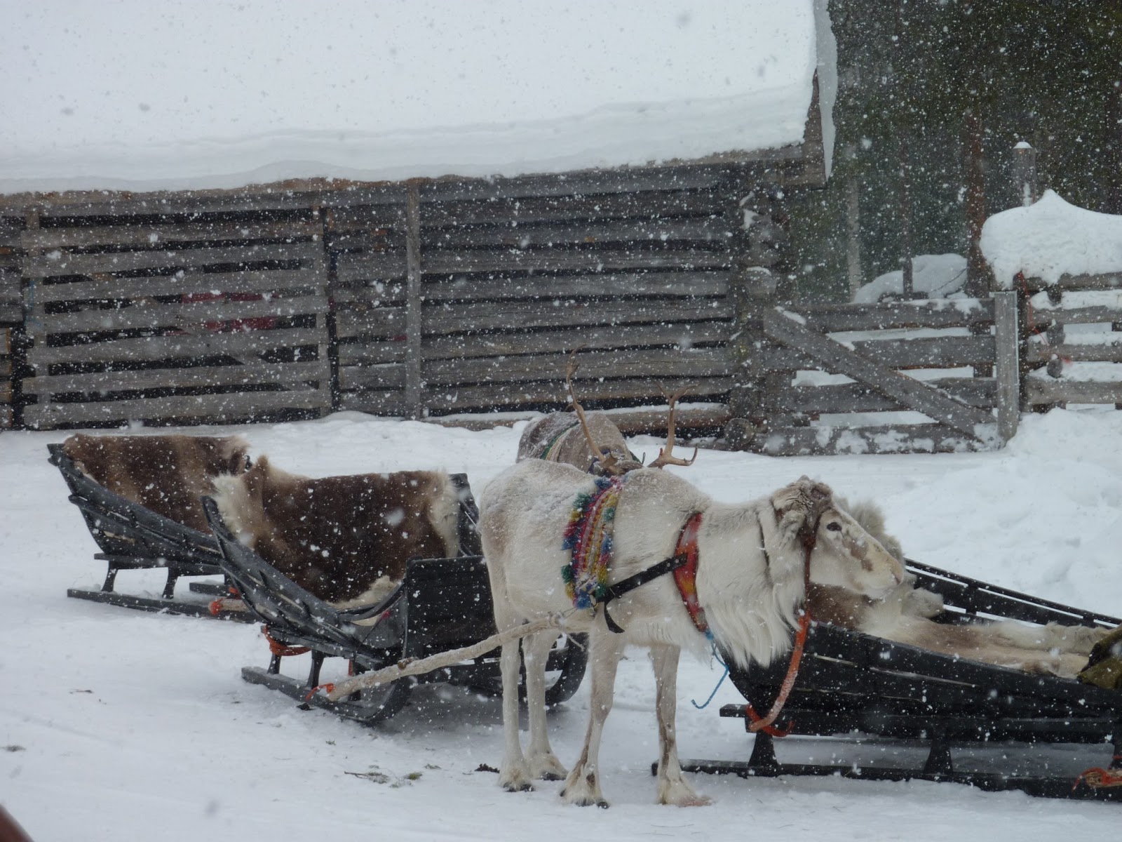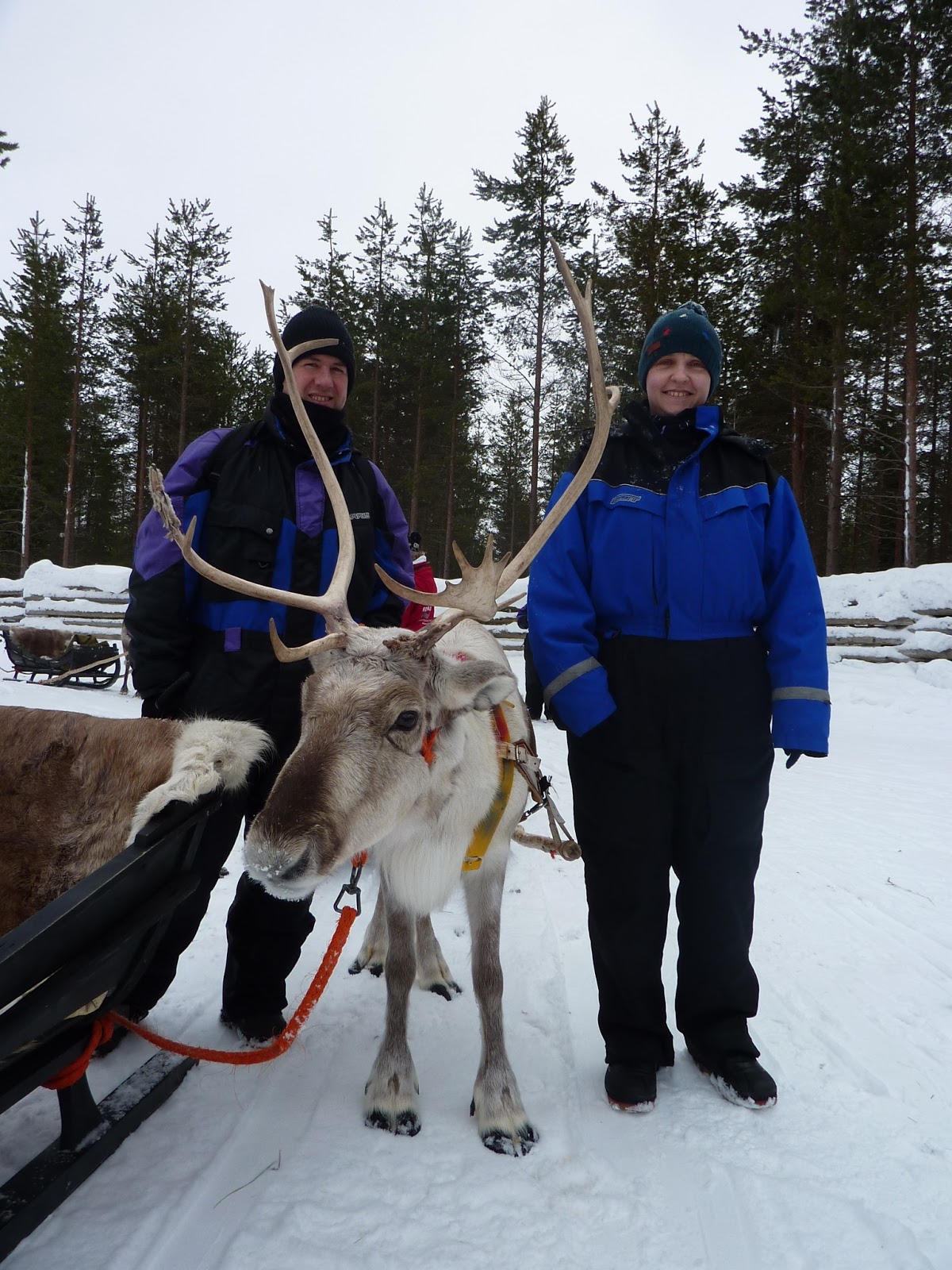 Today we visited a local reindeer farm where we had a sleigh ride through the forest. When we arrived at the farm we were taken to the reindeer and it was two people to a sleigh - all the sleighs were tied to each other so we didn't have to drive this time - just sit there and enjoy the view!