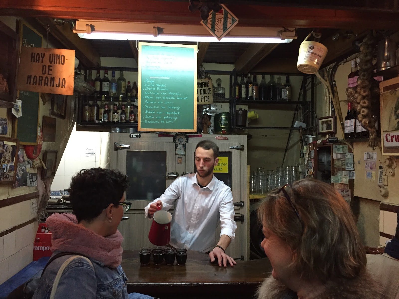 Our next stop was a typical 'hole in the wall' bar which was so busy! It was tiny and everyone was pushing and shoving to get to the bar - wherever you stood you were in the way. We said we would never have thought to stop here if we had not been on the tour and we tasted Manchego sheeps cheese and some delicious pork, all washed down with Orange wine.